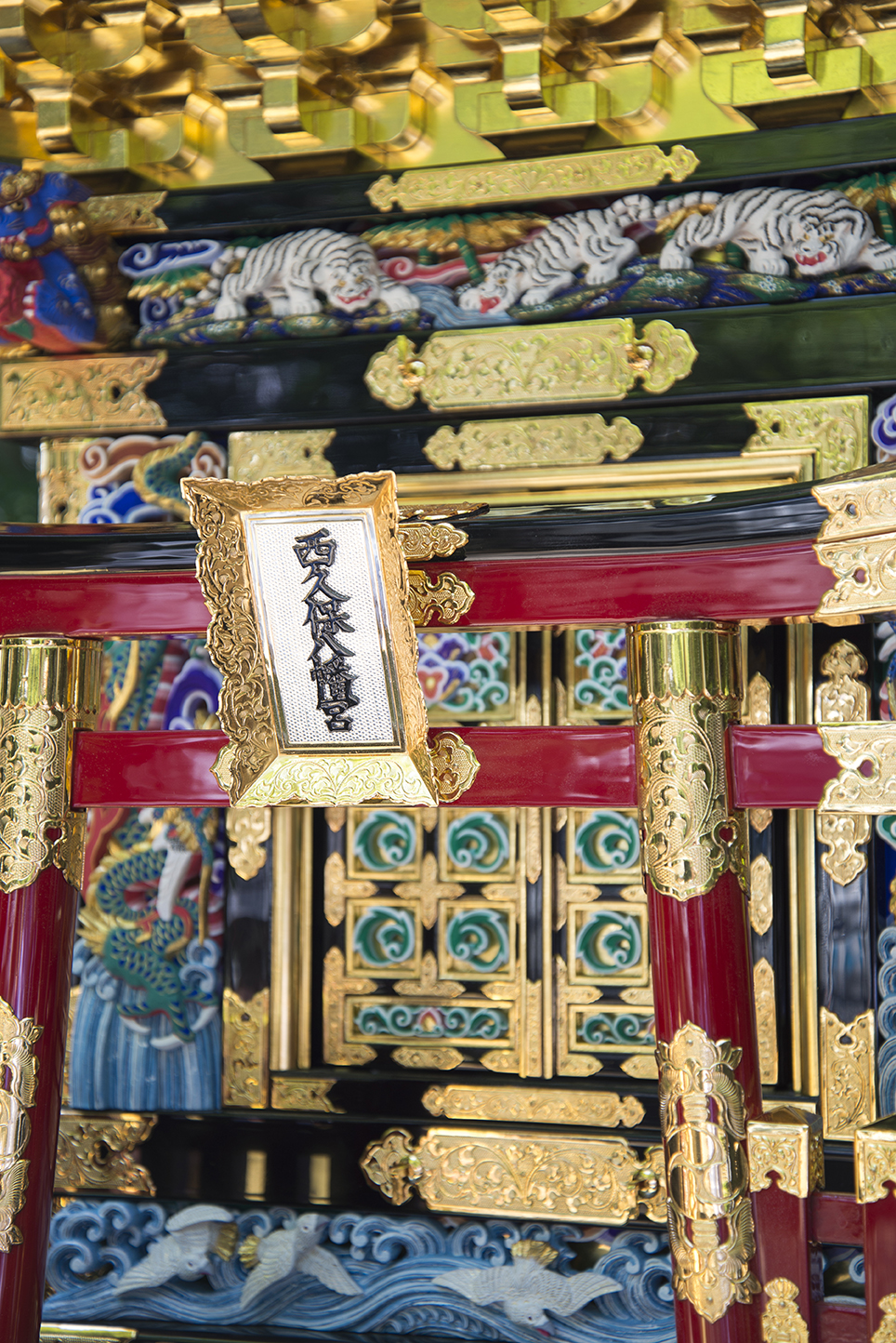 四面唐戸、その上の欄間には住所にちなみ虎の彫刻を配し、その両脇には狛犬を配す。