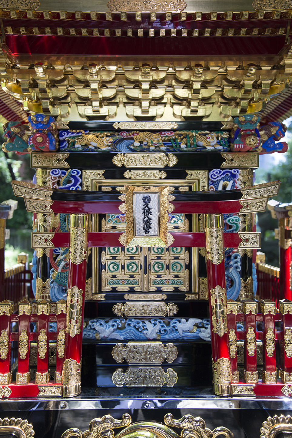 神輿は屋根延型、総漆、金箔押し、極彩色の彫刻、その他錺金具で飾られる。
